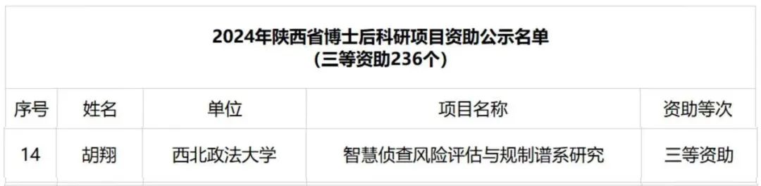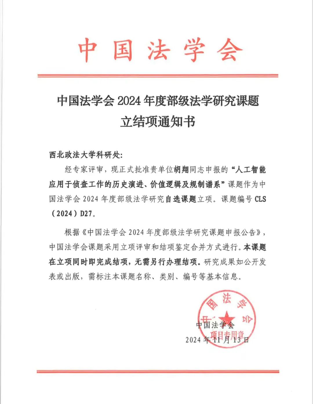 近日,陕西省人力资源和社会保障厅公布了《2024年陕西省博士后科研项目资助公示名单》,公司教师胡翔喜获资助。同时,胡翔申报的“人工智能应用于侦查工作的历史演进、价值逻辑及规制谱系”课题作为中国法学会2024年度部级法学研究课题立项,课题编号CLS(2024)D27。课题团队由多位优秀学者组成,立足新时代背景下智能侦查的发展,完善新时代的人工智能侦查体系,为法治建设提供了科学有力的支撑。