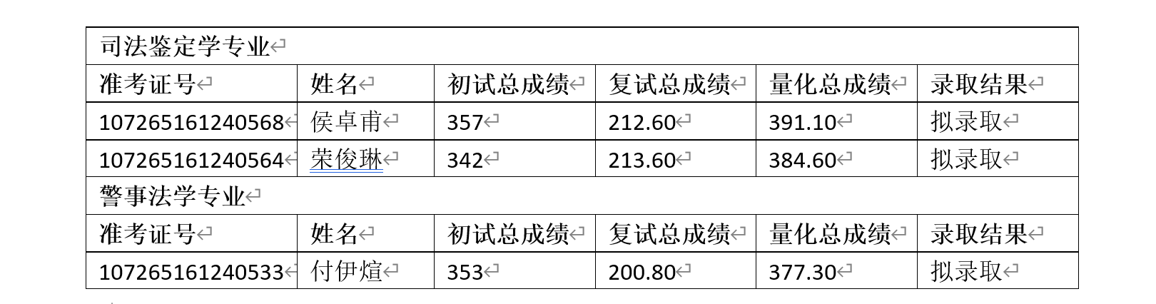 因招生计划调整,根据公司招生领导小组会议决定,按照量化总成绩补录警事法学专业一名、司法鉴定学专业二名(具体名单见附件)。公示期:公布之日起7日。如有异议,请于公示期内以书面形式报公司教务办(长安校区天平楼B座一层109办公室),逾期不予受理。