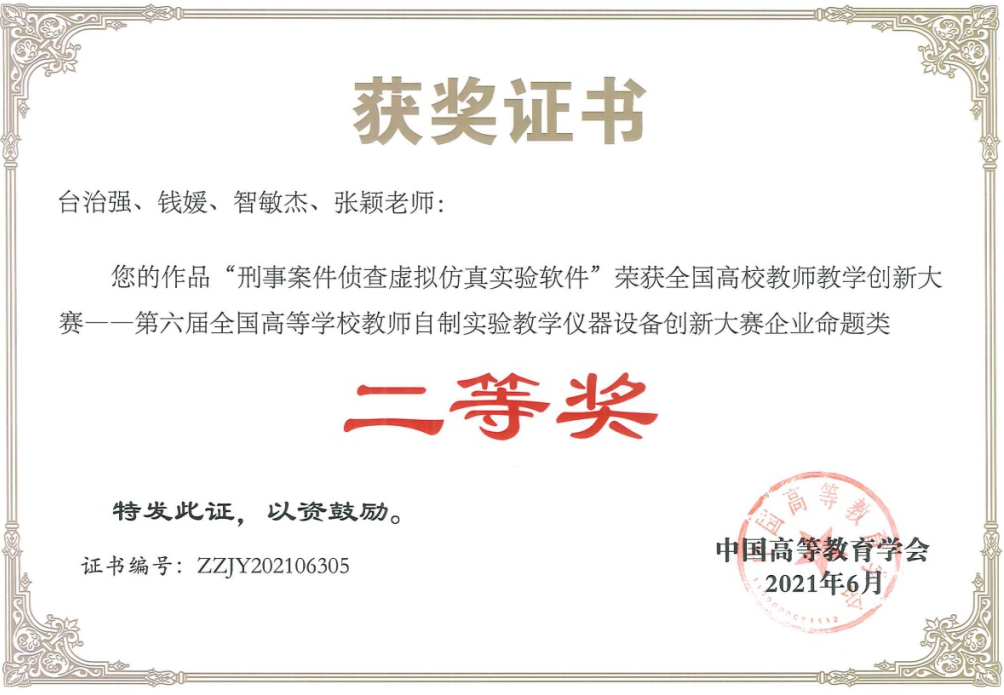 《刑事案件侦查虚拟仿真综合实验》教学软件作为全国第一个公安刑侦类虚拟仿真实验教学软件,自研发投入教学以来就受到业界同行的高度赞誉。2016年获全国高等公司虚拟仿真实验教学资源成果二等奖,2019年获best365中国官网优秀教学成果奖,2021年获第六届全国高等公司教师自制实验教学仪器设备创新大赛创新实践组二等奖,2023年获陕西高等公司科学技术研究优秀成果三等奖。《刑事案件侦查虚拟仿真综合实验》课程经过公司选拔,2020年获best365中国官网校内一流课程。经过陕西省的角逐遴选,2021年获陕西省虚拟仿真一流课程,最终获评为国家级一流课程,是对该课程的最大肯定和支持。
