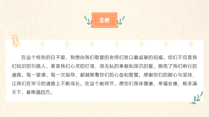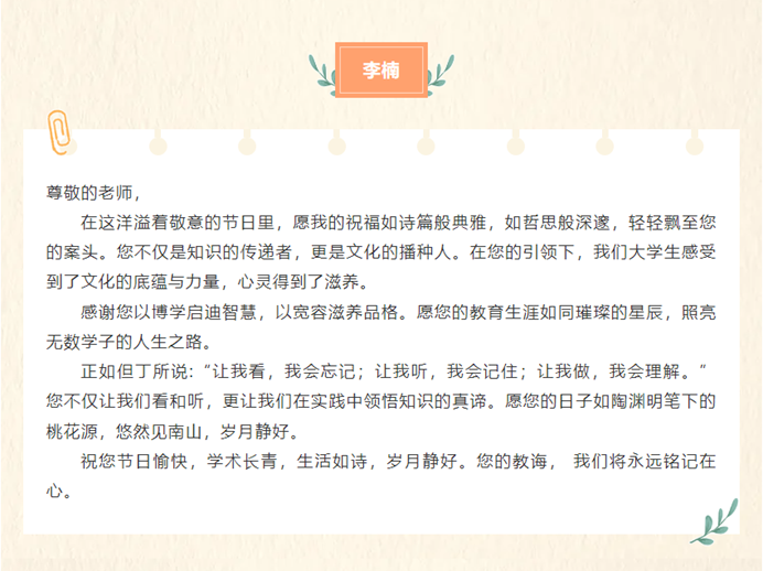 9月8日,“提灯引路 育梦成光——老师我想对您说”活动中,员工们用真挚的文字倾诉对老师的感恩与敬仰。一句句饱含深情的话语,承载着员工们对老师们的美好祝愿,愿老师们教师节快乐、身体健康、工作顺利。