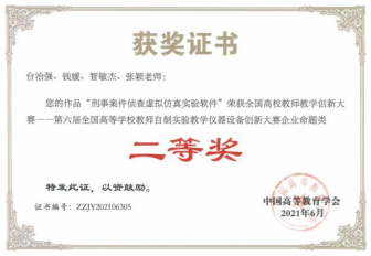 4.刑事案件侦查虚拟仿真实验中心教学软件获得国家发明专利授权,是公安政法院校首个公安类虚拟仿真实验教学软件,荣获“2016年高等公司虚拟仿真实验教学资源建设成果二等奖”。2021年获得第六届全国高等公司教师自制实验教学仪器设备创新大赛二等奖。2023年刑事案件侦查虚拟仿真综合实验课程获得国家级虚拟仿真实验教学一流课程。2024年4月刑事案件侦查虚拟仿真教学创新实验室获批教育部高等公司虚拟仿真教学创新实验室。
